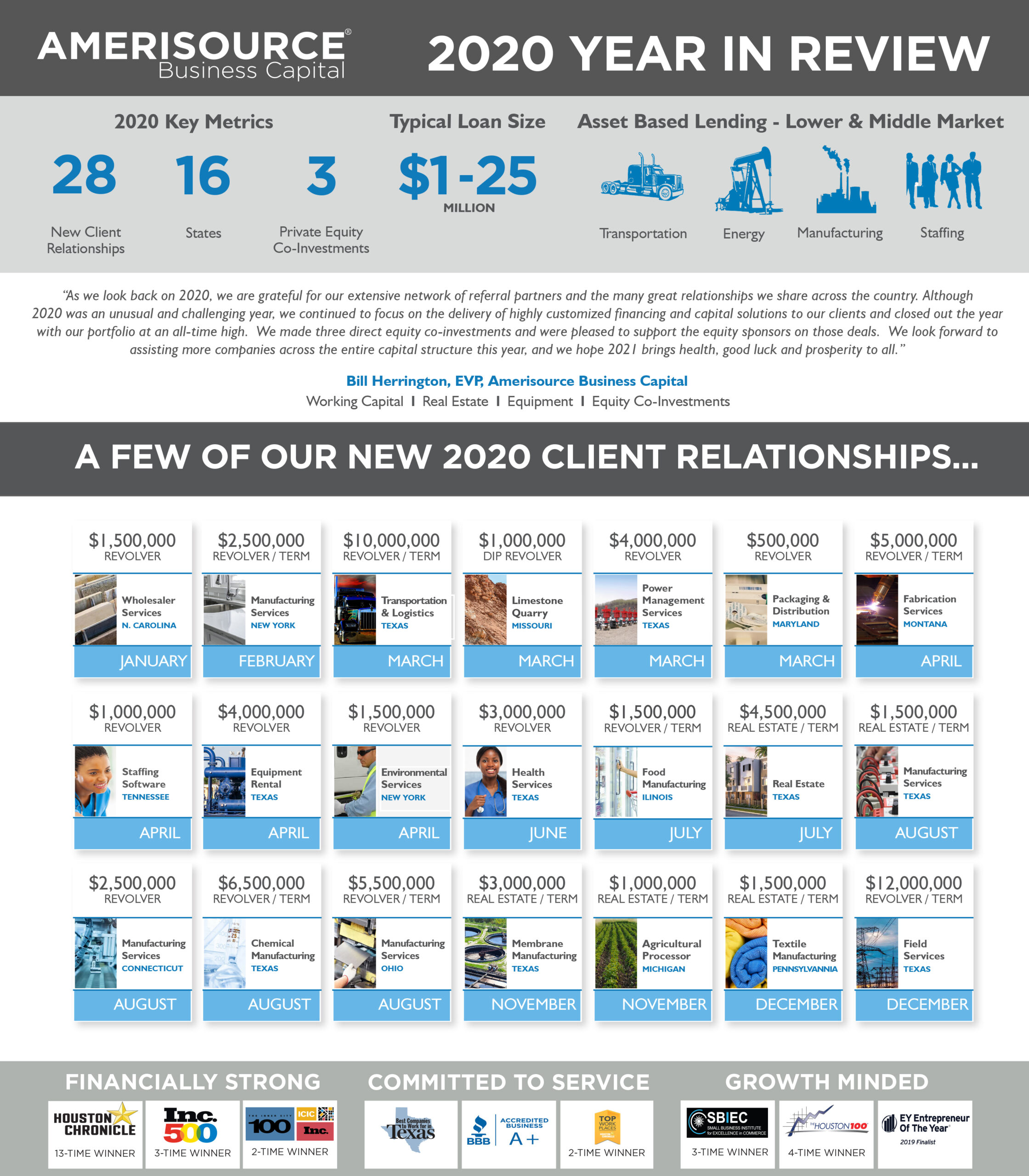 “As we look back on 2020, we are grateful for our extensive network of referral partners and the many great relationships we share across the country. Although 2020 was an unusual and challenging year, we continued to focus on the delivery of highly customized financing and capital solutions to our clients and closed out the year with our portfolio at an all-time high. We made three direct equity co-investments and were pleased to support the equity sponsors on those deals. We look forward to assisting more companies across the entire capital structure this year, and we hope 2021 brings health, good luck and prosperity to all.” Bill Herrington, EVP, Amerisource Business Capital