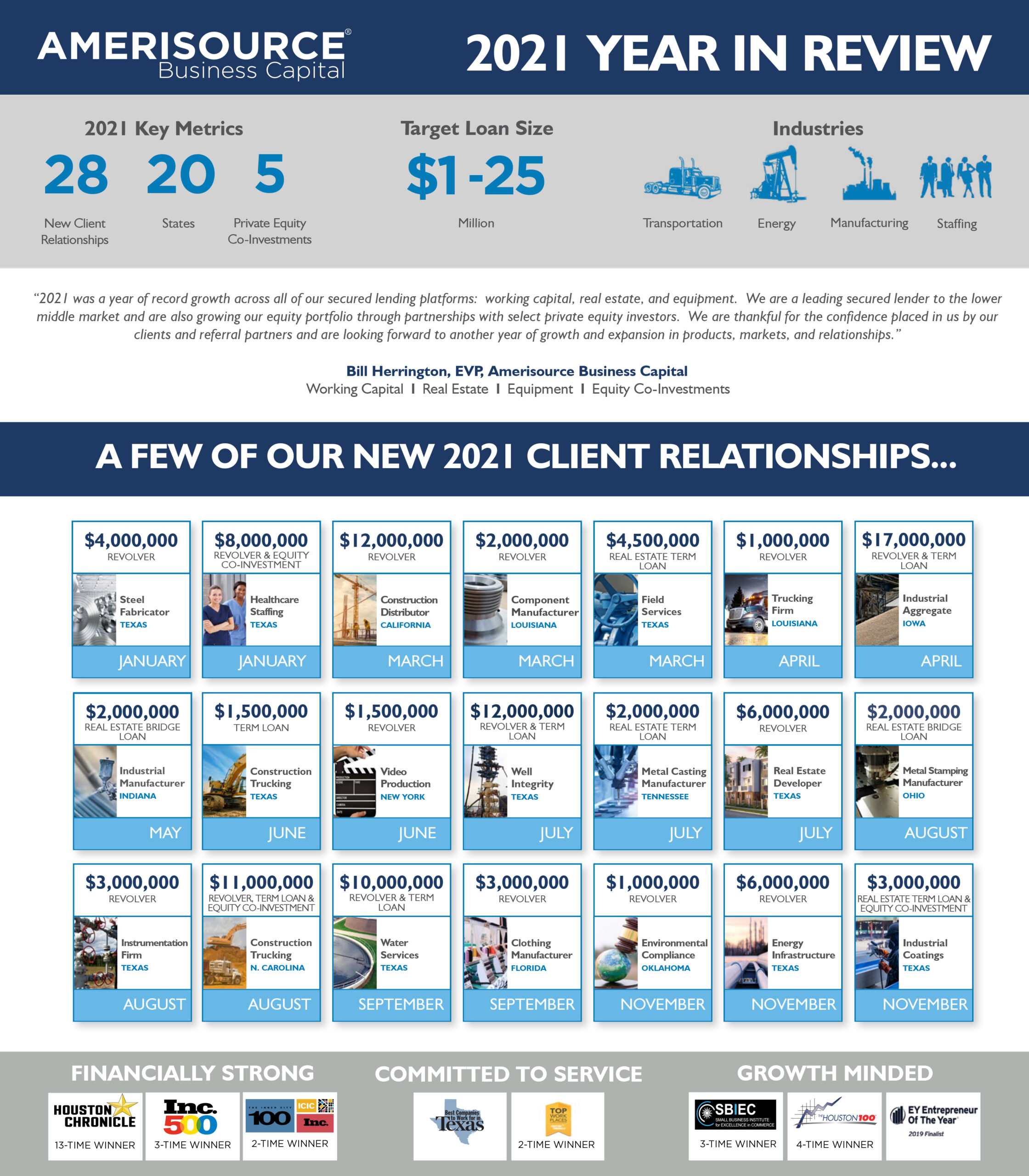 "2021 was a year of record growth across our secured lending platforms: working capital, real estate, and equipment. We are a leading secured lender to the lower middle market and are also growing our equity portfolio through partnerships with select private equity investors. We are thankful for the confidence our clients and referral partners placed in us and are looking forward to another year of growth and expansion in products, markets, and relationships.” Bill Herrington, EVP, Amerisource Business Capital.
